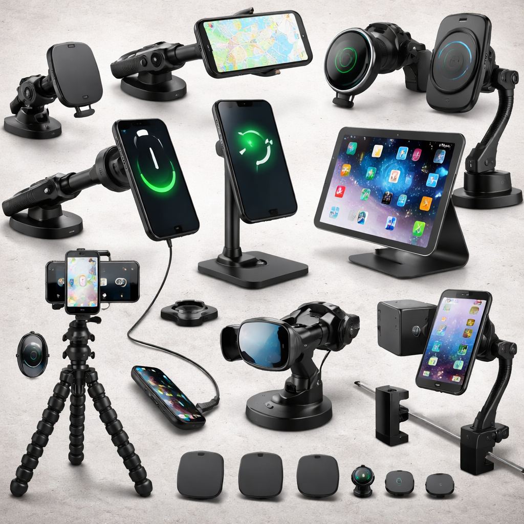 Mounting and holding accessories are designed to securely support and position devices like smartphones, tablets, and cameras. They improve convenience, stability, and usability in daily activities such as driving, working, or content creation.